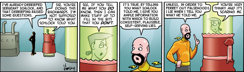 KEVYN: It's true. By telling you what Schlock told me, I give you ample information with which to build consistent, plausible, self-serving lies.