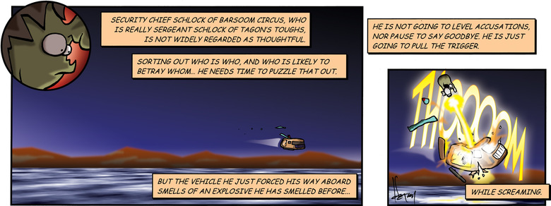 NARRATOR: Security Chief Schlock of Barsoom Circus, who is really Sergeant Schlock of Tagon's Toughs, is not widely regarded as thoughtful.
