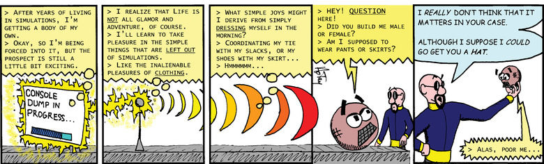 Ennesby: > After years of living in simulations, I'm getting a body of my own. > Okay, so I'm being forced into it, but the prospect is still a little bit exciting.