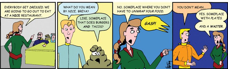 Breya: Everybody get dressed. We are going out to eat at a nice restaurant.