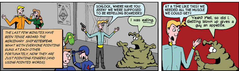 Schlock: Yeah? Well, so did I. Getting blown up gives a guy an appetite.