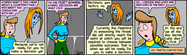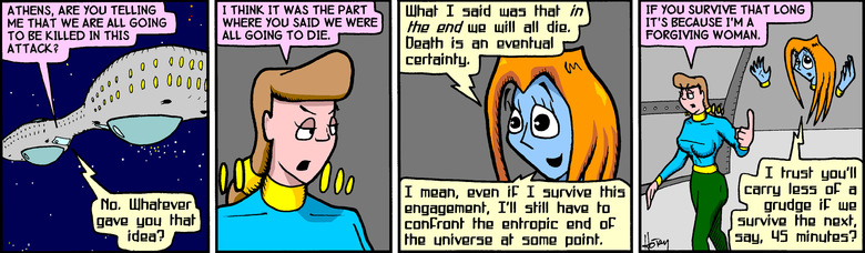Athens: What I said was that in the end we will all die. Death is an eventual certainty.I mean, even if I survive this engagement, I'll still have to confront the entropic end of the universe at some point.