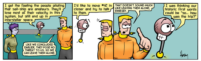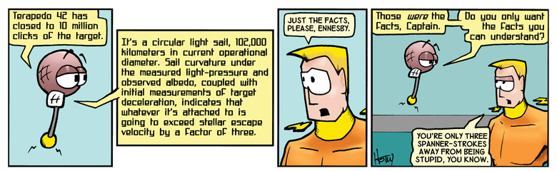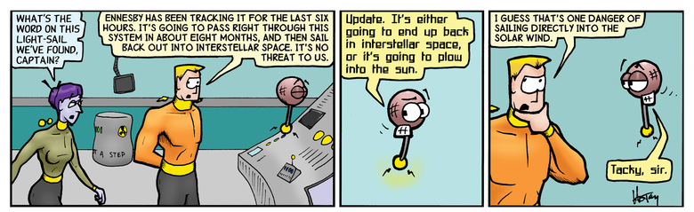 Fortunately, with the data provided in today's strip, readers need only assume the size and luminousity of the star to work things out for themselves. Unfortunately, they may also have enough motivation to do this math, since the author is going to offer sketches to the first five answers deemed correct by his panel of judges.