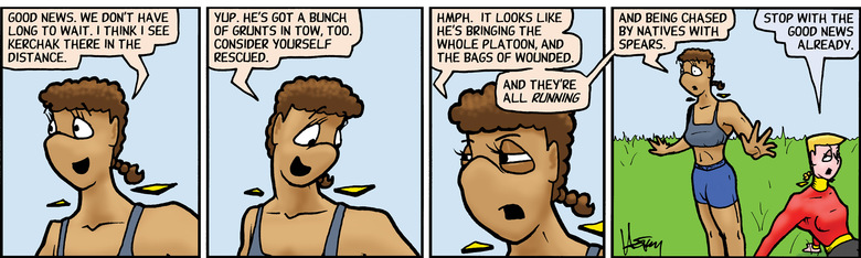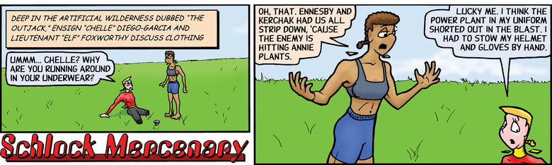 Narrator: Deep in the artificial wilderness dubbed "The Outjack", Ensign "Chelle" Diego-Garcia and Lieutenant "Elf" Foxworthy discuss clothing.