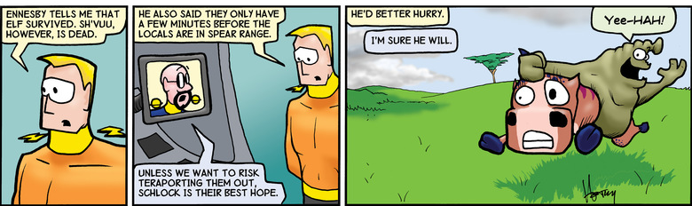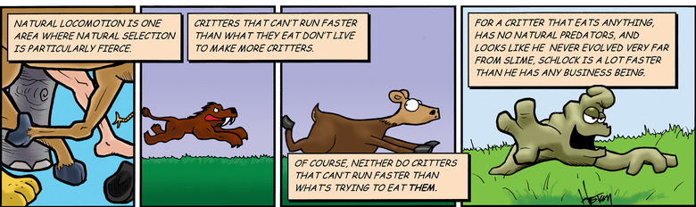 Narrator: For a critter that eats anything, has no natural predators, and looks like he never evolved far from slime, Schlock is a lot faster than he has any business being.