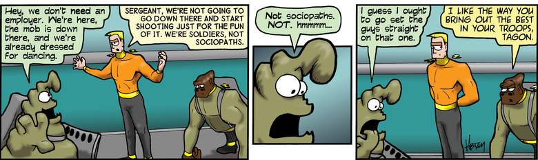Tagon: Sergeant, we're not going to go down there and start shooting just for the fun of it. We're soldiers, not sociopaths.