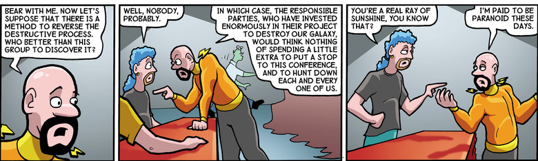 Kevyn: In which case the responsible parties, who have invested enormously in their project to destroy our galaxy, would think nothing of spending a little extra to put a stop to this conference, and to hunt down and kill each and every one of us.