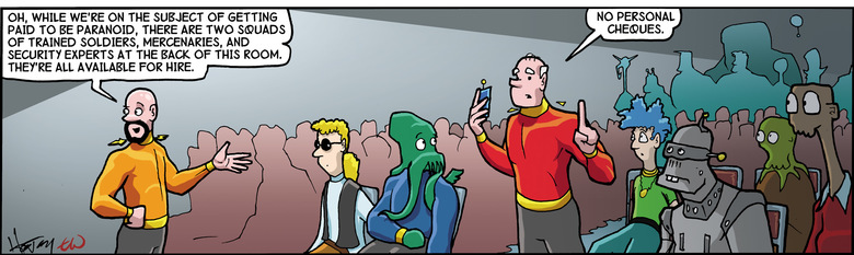 Kevyn: Oh, while we're on the subject of getting paid to be paranoid, there are two squads of trained soldiers, mercenaries, and security experts at the back of this room. They're all available for hire.