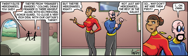KEVYN: They're from "Pranger's Bangers." Colonel Drake Pranger is there himself, along with his personal honor guard, to close a very rich deal with our captain's target.