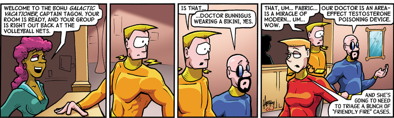 Desk clerk: Welcome to the Bohu Galactic Vacationer, Captain Tagon. Your room is ready, and your group is right out back at the volleyball nets.
