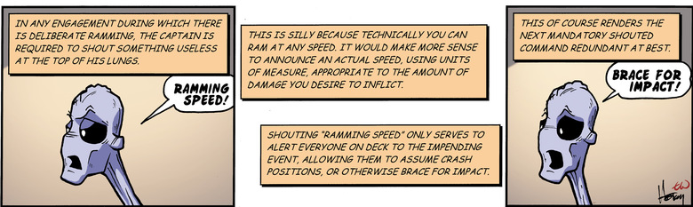 Narrator: Shouting "ramming speed" only serves to alert everyone on deck to the impending event, allowing them to assume crash positions, or otherwise brace for impact.