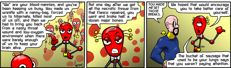 Nannie Avatar: "We" are your blood-nannies, and you've been keeping us busy. You made us wrestle with a nanny bag, forced us to hibernate, killed most of us off, and then we had to bring you back from a nasty throat wound and low-oxygen environment when there were barely enough of us to keep your brain alive.