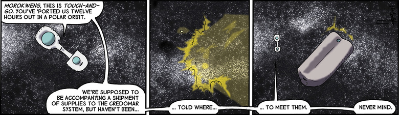 Captain Tagon: Morokweng, this is Touch-And-Go, you've 'ported us twelve hours out in a polar orbit.