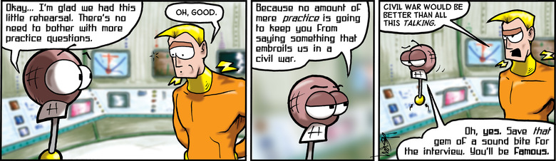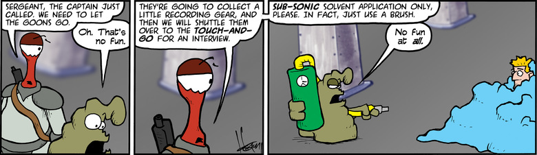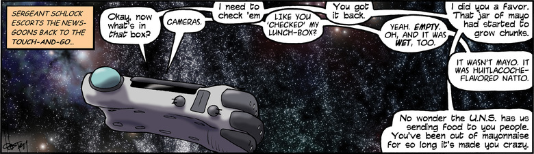 Narrator: Sergeant Schlock escorts the news-goons back to the Touch-And-Go.