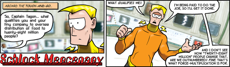 Schlock: No wonder the U.N.S. has us sending food to you people. You've been out of mayonnaise for so long it's made you crazy.