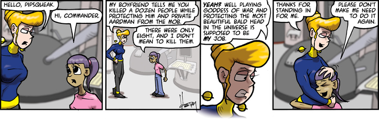 Elf: Yeah? Well playing Goddess of War and protecting the most beautiful bald head in the universe is supposed to be my job.
