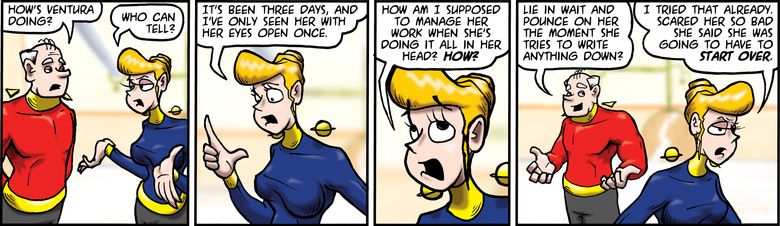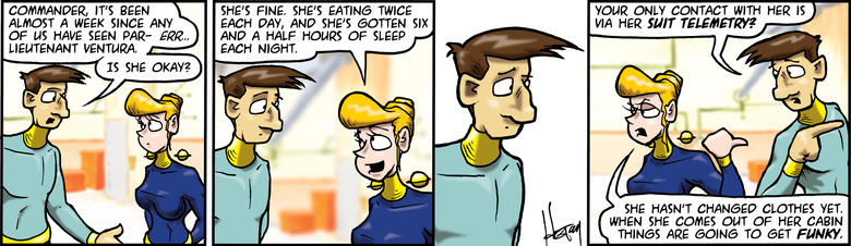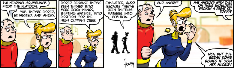 Elf: Bored because they've been turned into mere dock-hands, shifting materiel into position for the High Olympus crew.