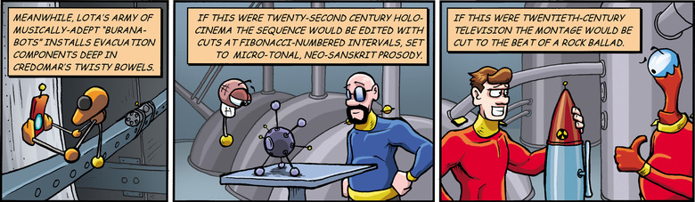 NARRATOR: If this were twenty-second century holo-cinema the sequence would be edited with cuts at Fibonacci-numbered intervals, set to micro-tonal, neo-sanskrit prosody.