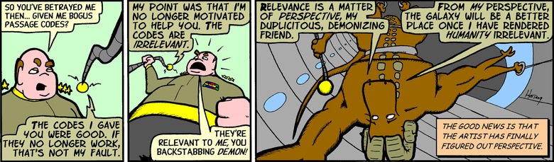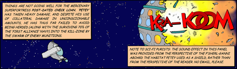 Narrator: Things are not going well for the mercenary superfortress Post-dated Check Loan. 'Petey' has taken heavy damage, and despite his use of collateral damage in unconscionable amounts, he has thus far failed to avoid being herded (along with the surviving 70% of the 'first alliance' navy) into the kill-zone by the swarm of evil munitions.Narrator: Note to sci-fi purists: The sound effect in this panel was provided from the perspective of the F'sherl-ganni aboard the habitat Petey used as a shield, rather than from the perspective of the reader. No email, please.