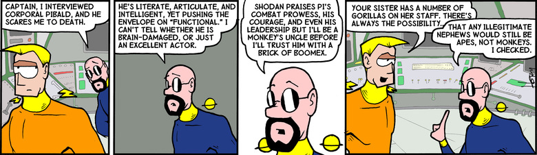 Kevyn: Shodan Praises Pi's combat prowess, his courage, and even his leadership but I'll be a monkey's uncle before I'll trust him with a brick of Boomex.