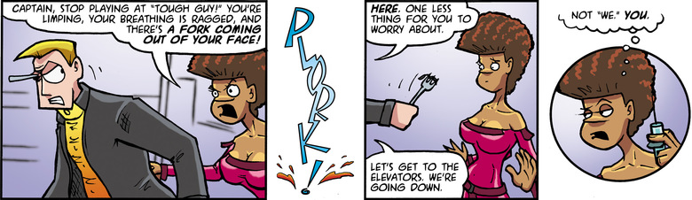 BUNNIGUS: Captain, stop playing at "Tough Guy!" You're limping, your breathing is ragged, and there's a fork coming out of your face!
