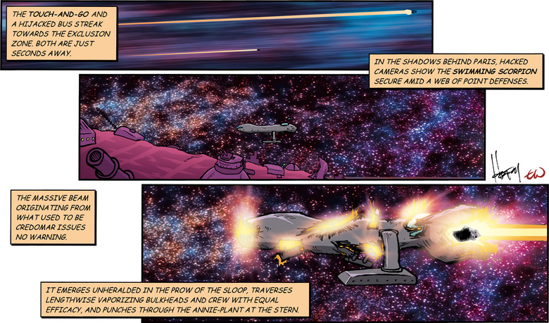 In the shadows behind Paris, hacked cameras show the Swimming Scorpion secure amid a web of point defenses.