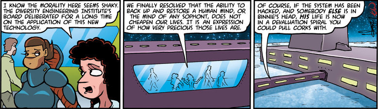 CIKITSAKA: We finally resolved that the ability to back up and restore a human mind, or the mind of any sophont, does not cheapen our lives. It is an expression of how very precious those lives are.