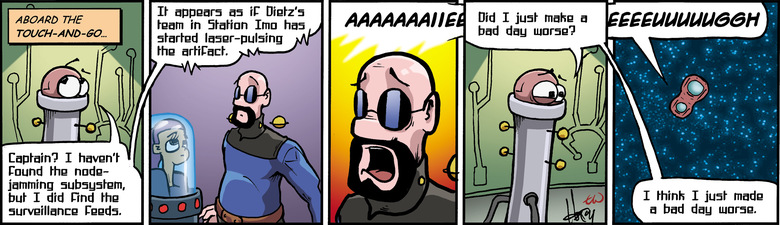 Note: Since there are likely some younger readers wondering what "E.T." is, there are no doubt older readers wondering how anybody would know about E.T. (let alone Skittles or "taste the rainbow") in the 31st century. By way of reminder, the two Gavcorps scientists in the above strip, Kevyn Dietz and Kent Rice, are transmogrified Gavs, and while they have full sets of fabricated memories and skills, they also retain their pre-freeze recollection of 20th and 21st century pop-culture: Skittles, E.T., Max Headroom, The Matrix, and a host of other long-forgottens.