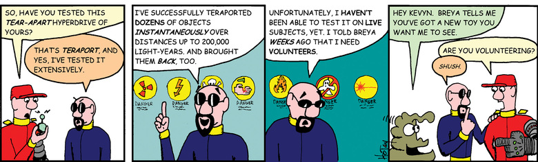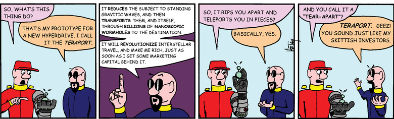 Kevyn: It reduces the subject to standing gravitic waves, and then transports them, and itself, through billions of nanoscopic wormholes to the destination. It will revolutionize interstellar travel, and make me rich, just as soon as I get some marketing capital behind it.