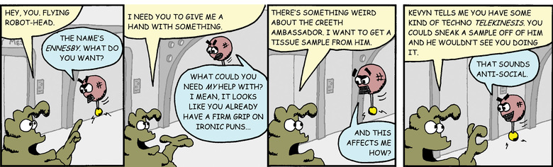 Schlock: Kevyn tells me you have some kind of techno telekinesis. You could sneak a sample off of him and he wouldn't see you doing it.
