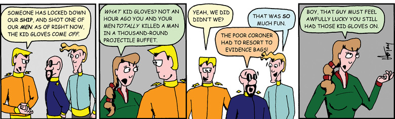 Tagon: Someone has locked down our ship, and shot one of our men. As of right now the kid gloves come off.