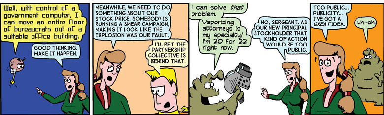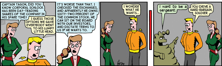 Breya: Captain tagon, did you know corporal schlock has been day-trading shares of the company in his spare time?