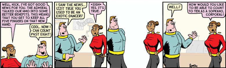 Bunni: Well, Nick, I've got good news for you. The Admiral talked our HMO into some better benefits. This means that you get to keep all five fingers on that new hand.