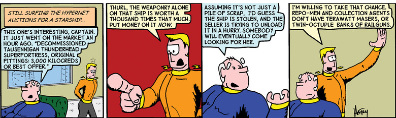 Thurl: This one's interesting, captain. It just went on the market an hour ago. "Decommissioned tausennigan thunderhead superfortress, original fittings: 3,000 Kilocreds or best offer."