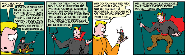 Devil Tagon: I'm your shoulder devil. I'm a metaphor for the temptations and enticements that might prevent you from following your conscience down the path of righteousness.