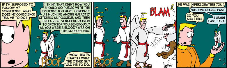 Devil Tagon: I think that right now you should go public with the evidence you have, generate as much ire among galactic citizens as possible, and then find a rich, vengeful patron to sponsor you generously as you wage a bloody war on the Gatekeepers.