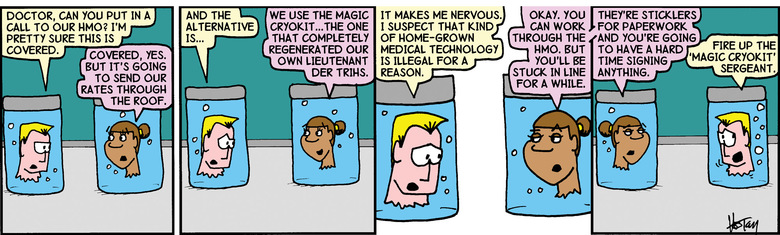 Narrator: So... With practically the entire company suffering from decorpitation, what are our heroes up to?
