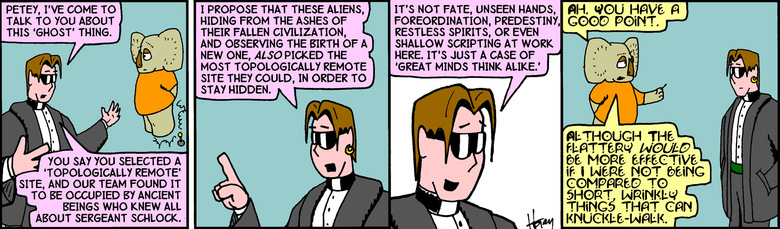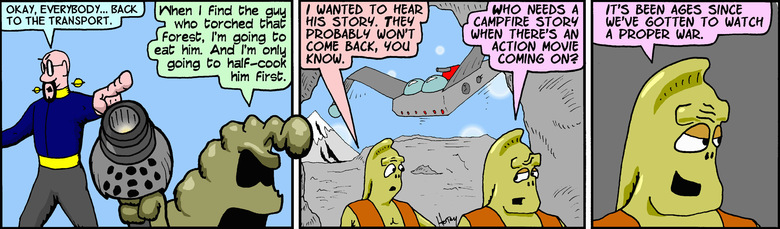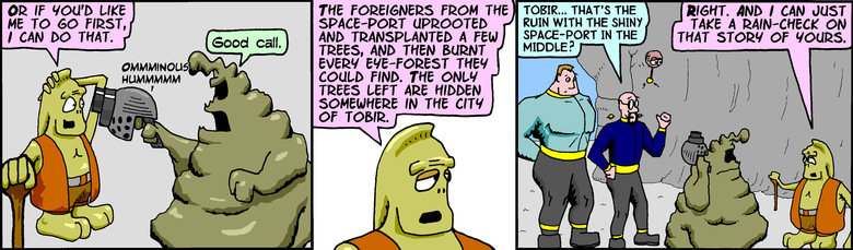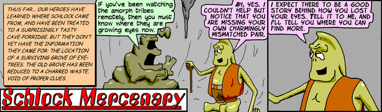 Narrator: Thus far. . . Our heroes have learned where Schlock came from, and have been treated to a suprisingly tasty cave-porridge. But they don't yet have the information they came for: The location of a surviving grove of eye-trees. The old grove has been reduced to a charred waste, void of proper clues.