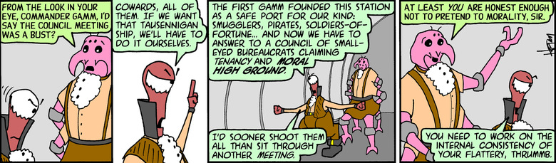 Gamm: The first Gamm founded this station as a safe port for our kind: smugglers, pirates, soldiers-of-fortune. . . and now we have to answer to a council of small-eyed bureaucrats claiming tenancy and moral high ground.