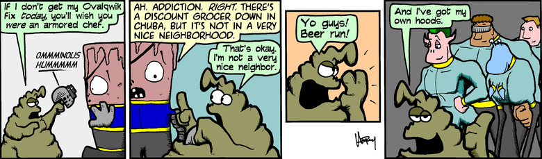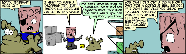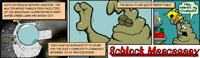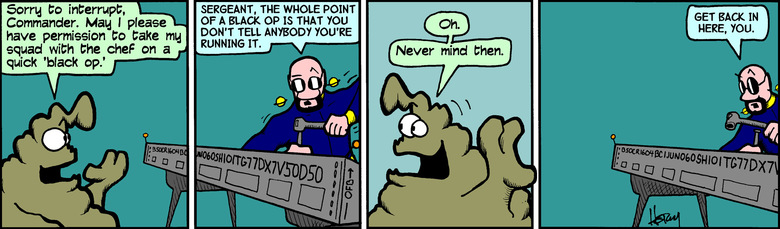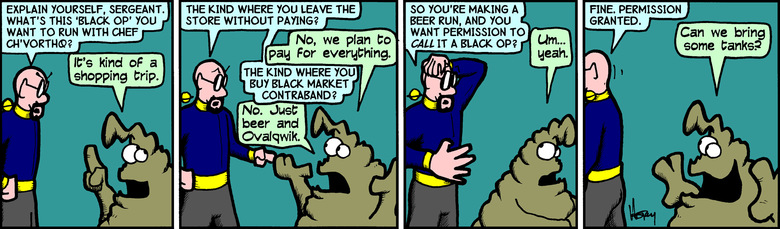 Schlock: Sorry to interrupt, Commander. May I please have permission to take my squad with the chef on a quick 'black op.'