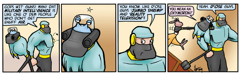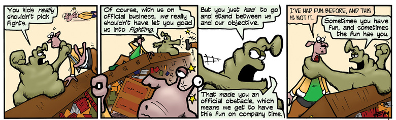 Schlock: But you just had to go and stand between us and our objective.That made you an official obstacle, which means we get to have this fun on company time.