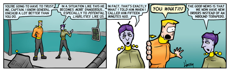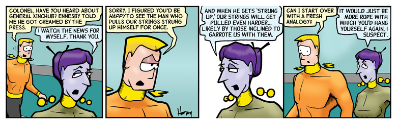 Captain Tagon: Colonel, have you heard about General Xinchub? Ennesby told me he got creamed by the press.