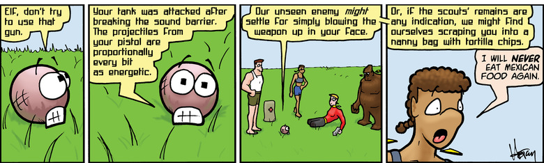 Ennesby: Our unseen enemy might settle for simply blowing the weapon up in your face.Or, if the scouts' remains are any indication, we might ourselves scraping you into a nanny bag with tortilla chips.