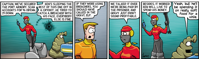 Ken's sleeping the rest of this one off in a cryokit. He tried to catch a breacher with his face. Everybody else is fine.