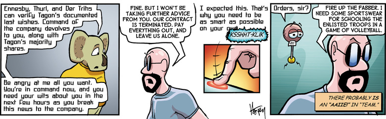 PETEY: Ennesby, Thurl, and Der Trihs can verify Tagon's documented last wishes. Command of the company devolves to you, along with Tagon's majority shares.