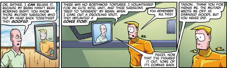 Der Trihs: There was no Borthwog torturer. I volunteered for an elite intel unit, and their surgeons tried to "upgrade" my brain. When I came out a drooling idiot, they implanted a cover story.