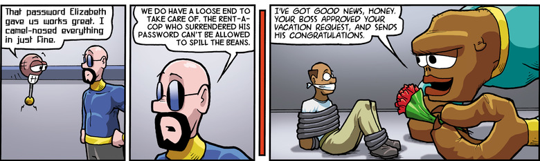 Kevyn: We do have a loose end to take care of. The Rent-A-Cop who surrendered his password can't be allowed to spill the beans.