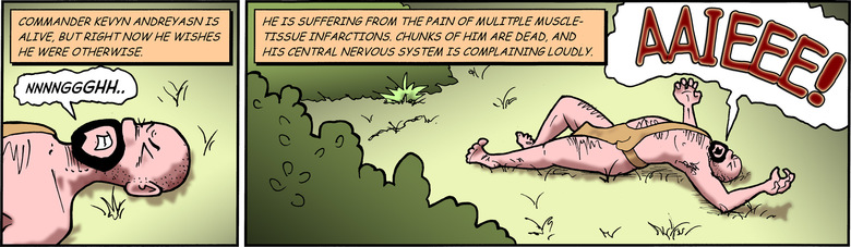 Narrator: Flat on his back in agonizing pain, Kevyn stares at the sky.