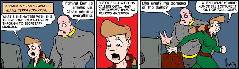 By the same token, the shadow cast by the Touch-And-Go on the Morkweng is three kinds of impossible. TAG's shields should distort starlight preventing the penumbra, 'Kweng's tractor field should distort whatever starlight goes around TAG, and Kweng's shields really shouldn't be allowing light to fall on the battleplate. In short, there should be no shadow for us to see, even if we could see through the shields to the Morokweng.