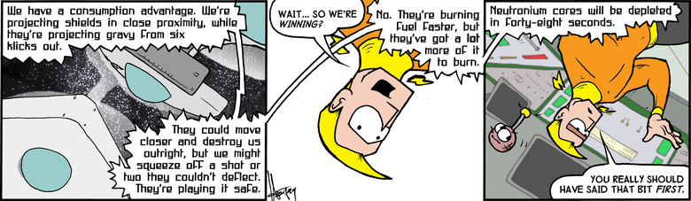 I suppose someday when I'm in a hurry I'll just drop a starfield into panels like this, black some bits out, slap some distortion filters on the whole mess, and then ramble about how uninteresting space combat is to look at.
